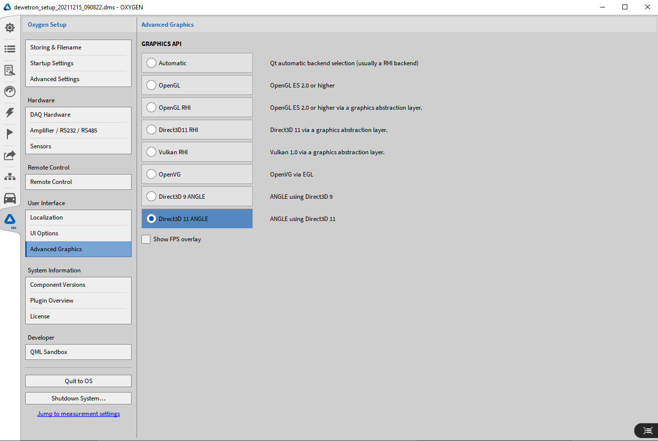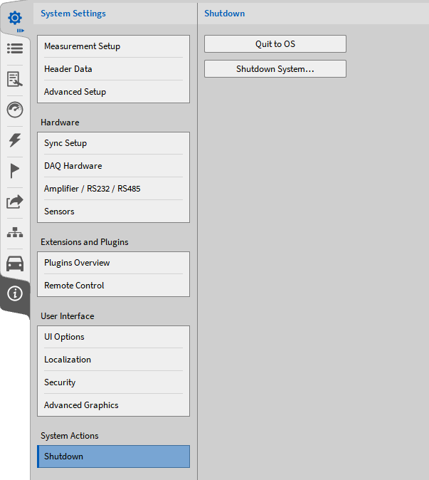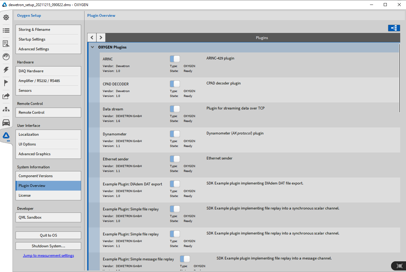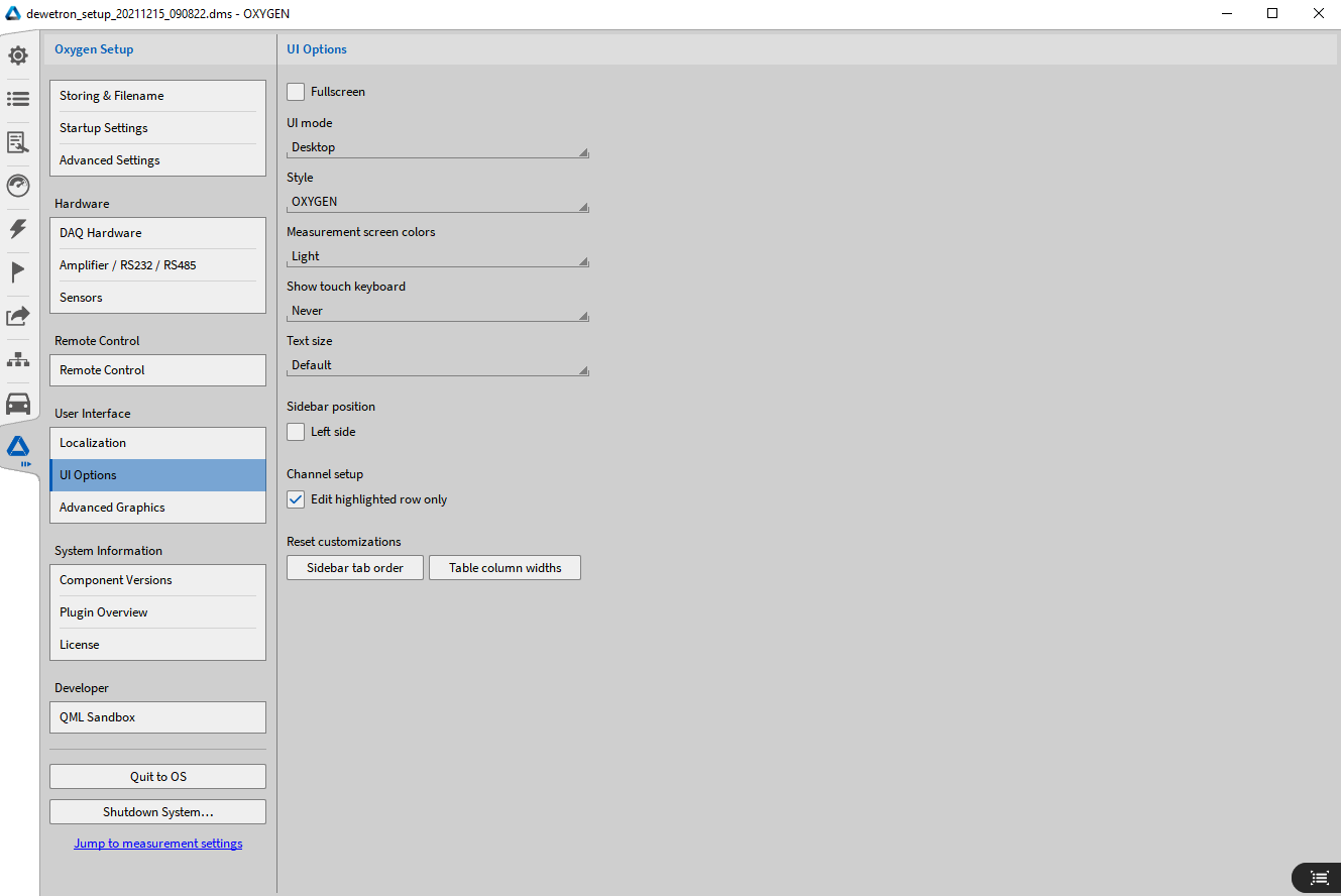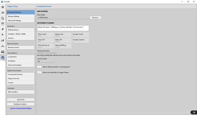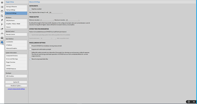 其他设置: 可以在此设置系统关闭时同时关闭OXYGEN用于保护。另一个设置是可以取消一些确认信息的弹出,例如“保存设置”或“放弃保存”,此功能在自动化测试应用中很方便,但是手动设置是时应尽量显示提示信息,防止误操作。第三个设置默认激活,并允许以压缩数据格式保存记录的测量文件。在这两种情况下,压缩和未压缩测量文件的数据类型都是.dmd。有了这个设置,测量文件的大小最多可以减少30%。但是,使用压缩的测量文件会导致更高的系统负载,如果系统负载过高,则应停用该功能。