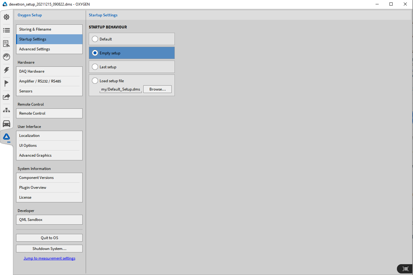 用户可以选择启动OXYGEN时是否打开默认设置文件、空设置文件、最后一个设置文件或用户自定义的设置文件(见图 Fig. 145).
