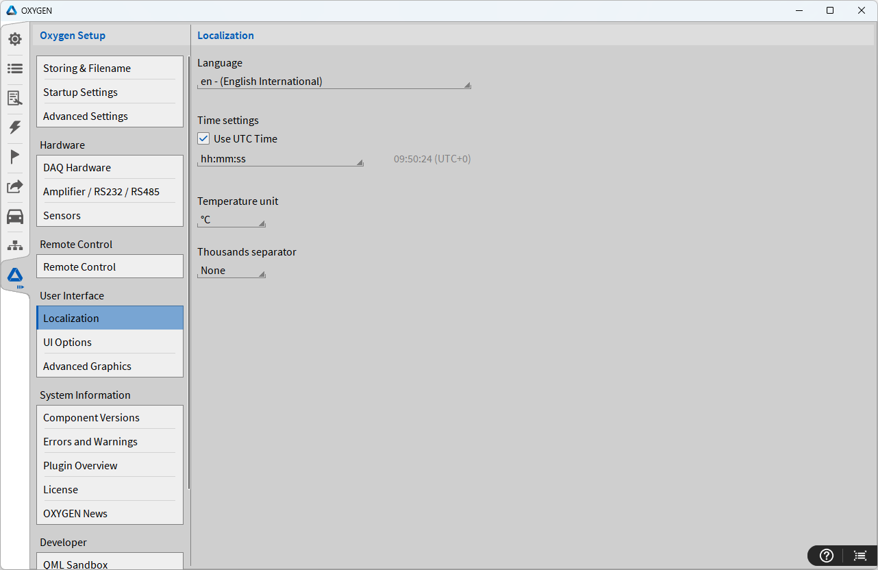 OXYGEN软件设置菜单包含所有影响软件设置的设置, 并将存储在注册表中。这些设置默认保存, 不需要保存在配置文件中。