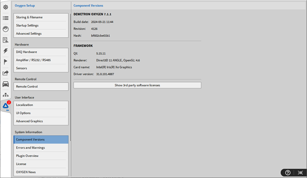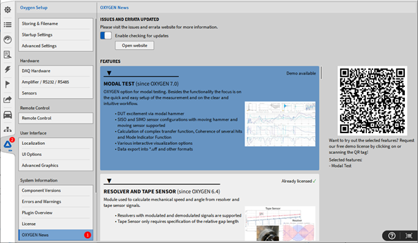 在OXYGEN新功能选项卡中,您可以查看已知问题的信息,并激活这些问题的自动更新以及可用功能的列表。