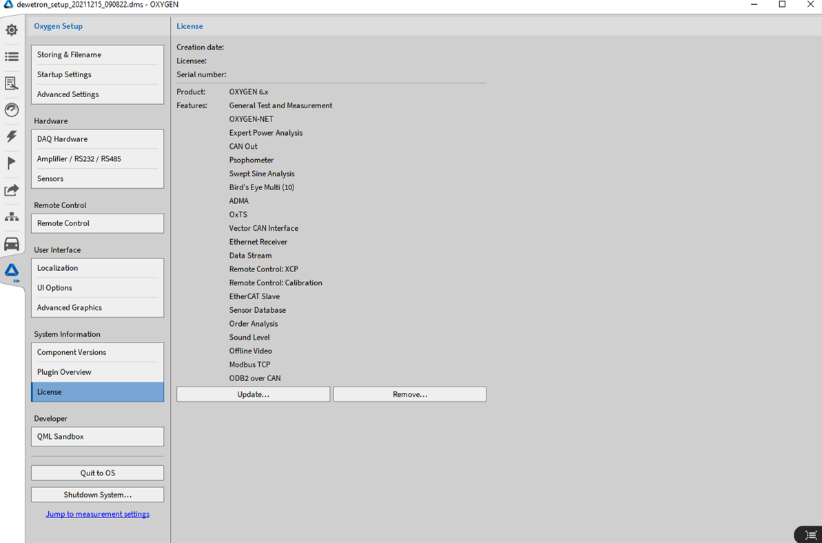 在这里你可以找到一些关于授权以及其带有的功能的信息。另外可通过点击更新按钮选择新的授权文件来更新授权。Oxygen必须被重启。点击移除按钮可移除现有的授权, Oxygen会进入评估模式。