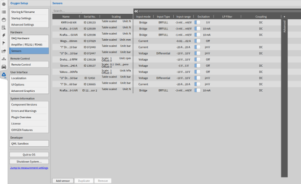 OXYGEN 支持将所有用户使用的传感器信息(灵敏度, 激励电压, 滤波, 偏置等)录入到传感器库