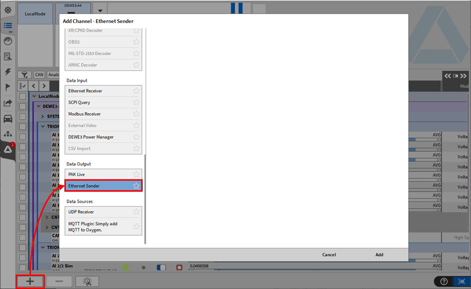 可通过在通道列表菜单左下角的加号按钮添加以太网发送并配置 (图. Fig. 328 标红处).