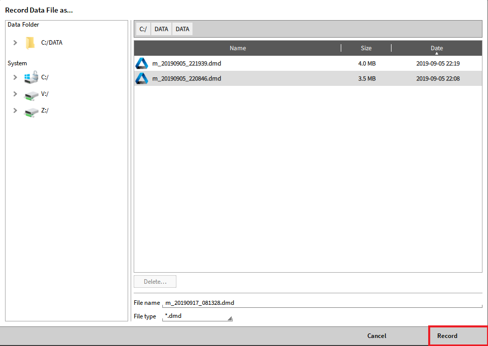 注意:输入文件名后, 在弹出窗口中点击记录按钮(图 Fig. 143 中红色标记)即可开始记录。