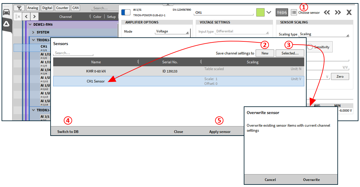也可以将传感器集直接从通道列表传输到传感器数据库,或者覆盖数据库中的现有传感器 (见图 Fig. 156).