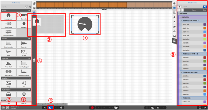 若要将显示工具添加到测量界面上, 用户须在测量界面点击“显示工具”菜单。鼠标左键点击选择所需的显示工具 (①) ;保持左键按住状态, 将显示工具拖拽到测试界面 (②) , 将其移动至任意位置, 释放左键即可放置此显示工具 (③) 。 在图 Fig. 390 的例子中, 我们添加一个转速表, 这些工具与界面背景中的灰色网格对齐。当显示工具被添加到测量屏幕时, 测试界面设计模式被自动激活。