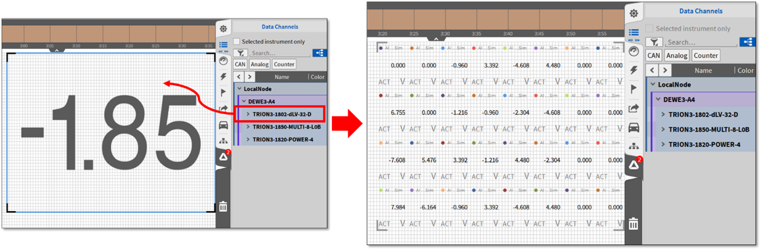 要将所有测量值添加到显示工具中,须将显示工具放在测量屏幕上,然后将整张板卡或主机直接拖拽到显示工具中,而不用每通道单独添加。