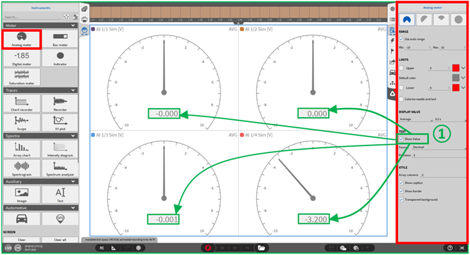 显示数值: 如果“显示数值”勾选框被选中 (见 ① 图. Fig. 394),测试值将会以数字的形额外显示在模拟指针表中。