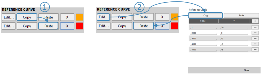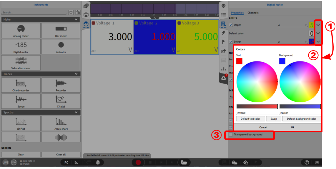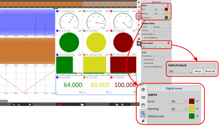 限值警报: 用于设置显示值的上下限, 当显示值超过限制条件时, 数值会以其他颜色来给出警示, 警示颜色可自定义。 当通道数目很多时, 用户可以直观看到某些超限值。图:numref:limits 说明了这一点。可以为上限和下限定义颜色,也可以在上限和下限之间定义默认颜色。首先,有必要为限制定义一个值(默认设置除外)。然后,可以通过按下如图:numref:limits 所示的按钮①来定义文本和背景的颜色。当按下①中的一个按钮以获得相应的限制时,将出现一个新窗口(图:numref:limits 中②)。这里可以定义文本本身的颜色以及背景的颜色。使用“默认文本颜色”和“默认背景颜色”按钮可以返回默认设置,使用“切换”按钮可以切换文本和背景的设置。按下“确定”按钮,所选数字仪表的设置将被存储。