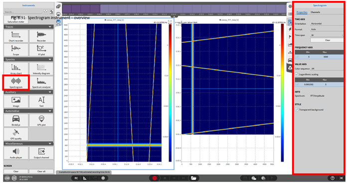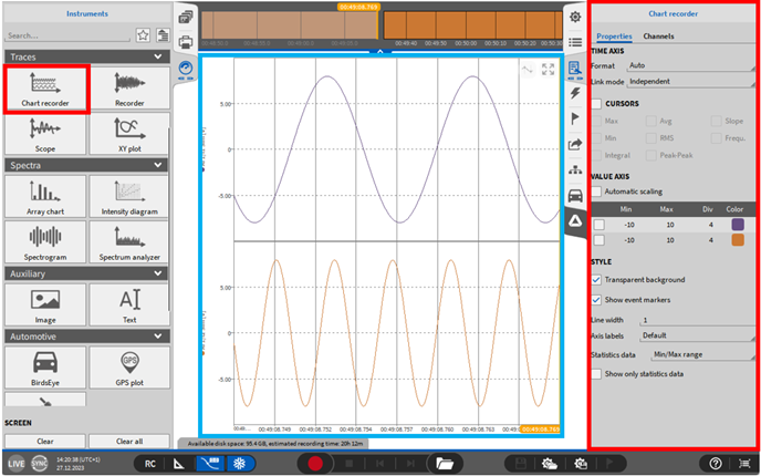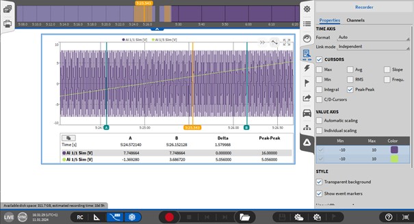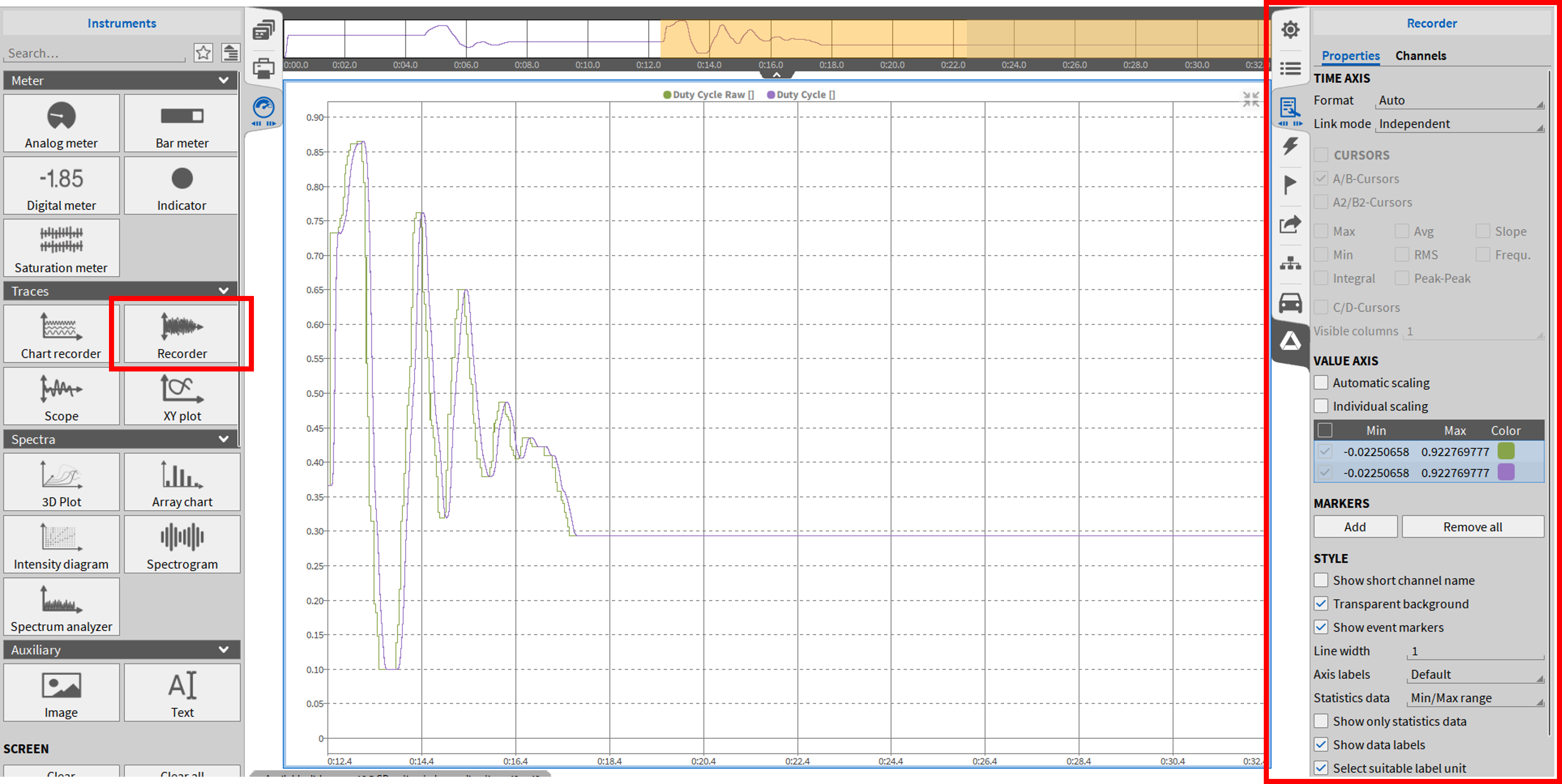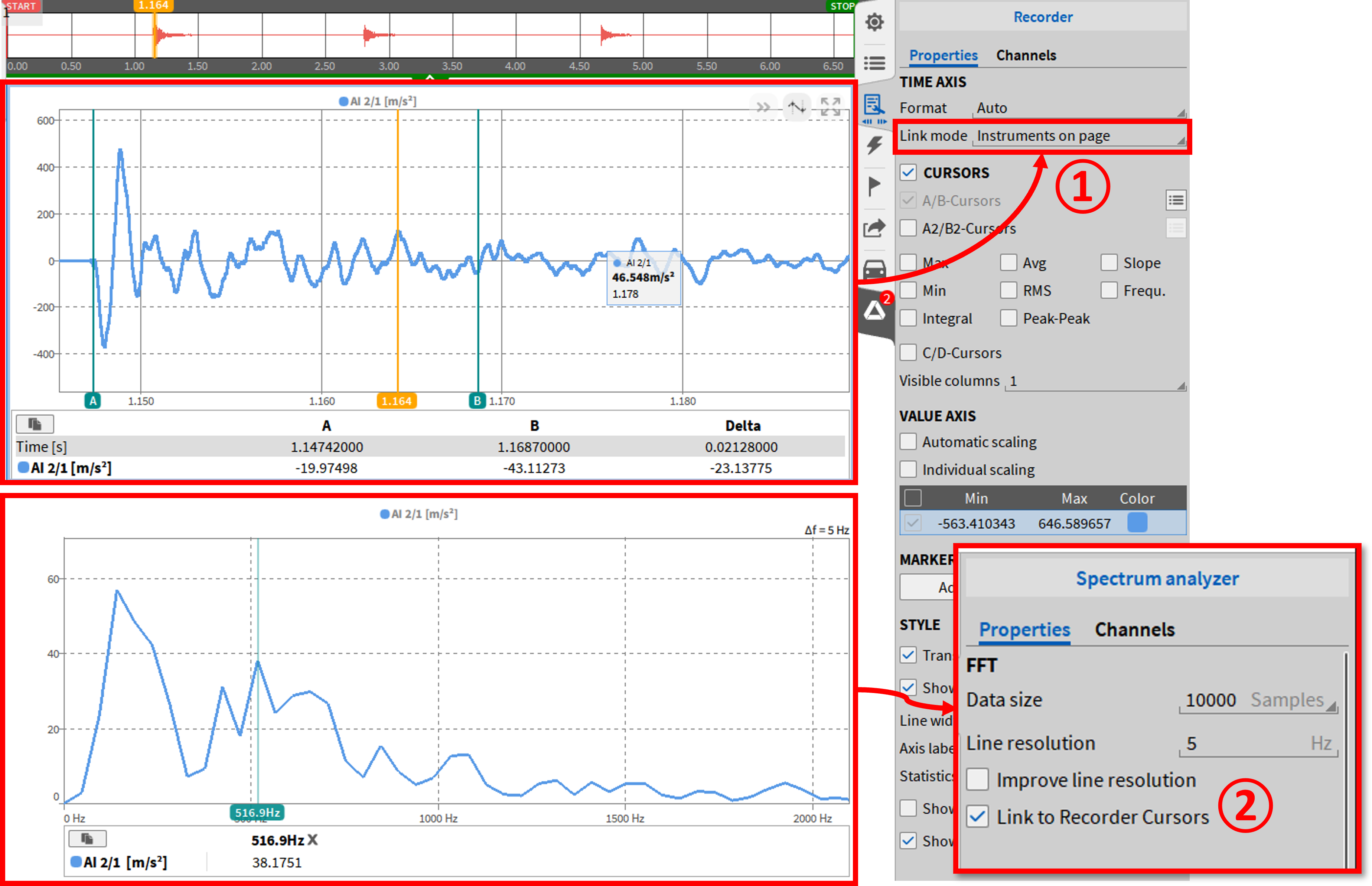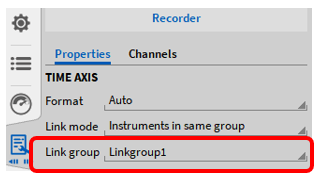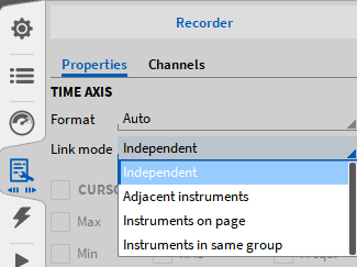 它可以连接几个相邻记录器的时间轴,在一页上所有记录器的时间轴,或者可以定义记录器组,也可以在几个测量屏幕上连接。这大大缩短了使用多个记录器进行缩放操作的时间。该功能可以在仪器属性 (如图 Fig. 401) 中链接模式下拉菜单中选择, 并且必须分别为每个记录器选择。