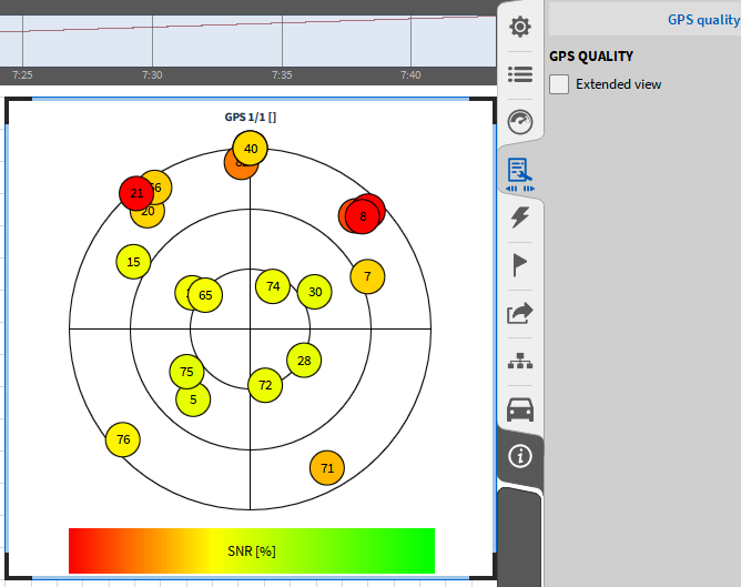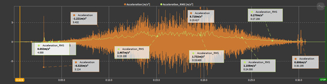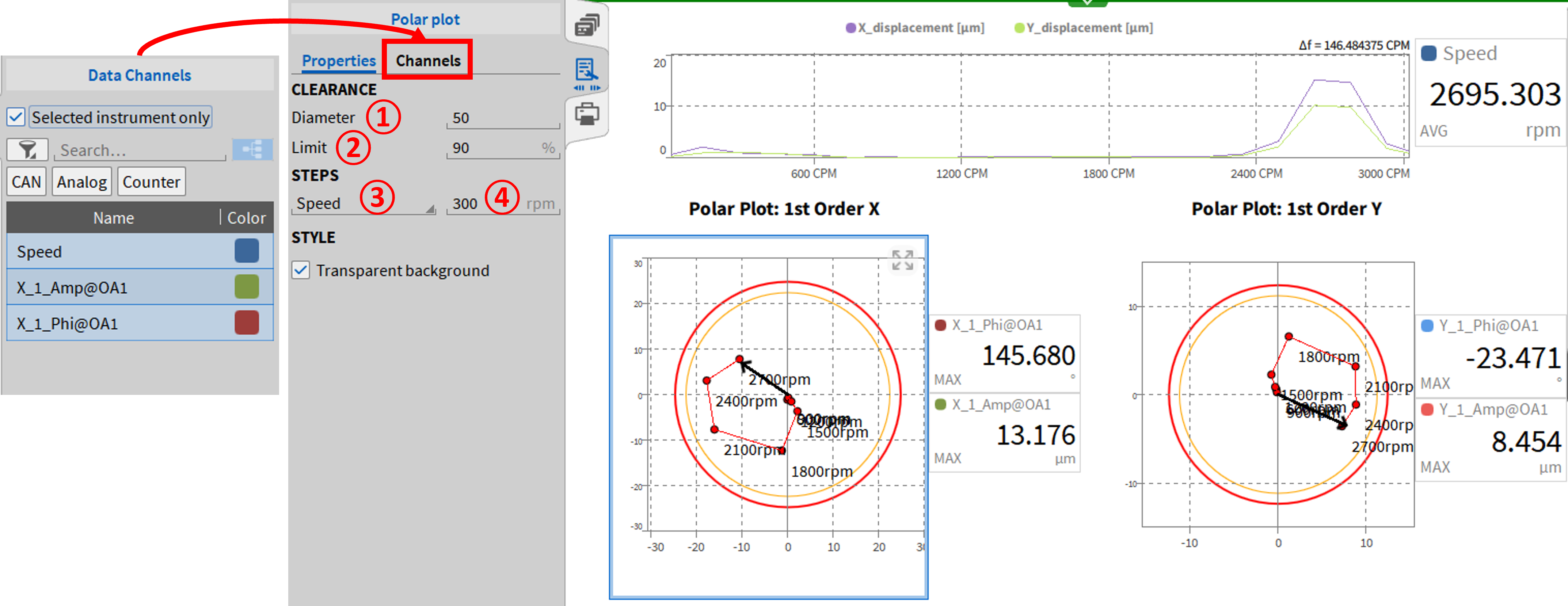 极坐标图仅需要阶次分析(需要阶次跟踪选项)下的转速、幅度和相位结果。与轴轨迹相同显示工具由红色和黄色两个圆组成,红色表示轴的运动间隙直径①,黄色是自定义的限值区间②。可以选择速度或者时间步长用于每个极坐标点的绘制,其中时间或速度的选择在③处,步长在④处设置。极坐标矢量的长度代表幅值,角度代表到编码器起始点的相位偏移。这意味着,在下面的例子中,X的最大偏移量是13um,且从速度信号判断,这个角度偏差为145度。