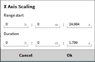 通过鼠标左键或者触摸屏, 点击波形 X 轴并保持点击状态, 此时会出现 X 轴缩放选项。 将鼠标移至需要缩放的选项, 释放鼠标左键即可。 缩放范围: