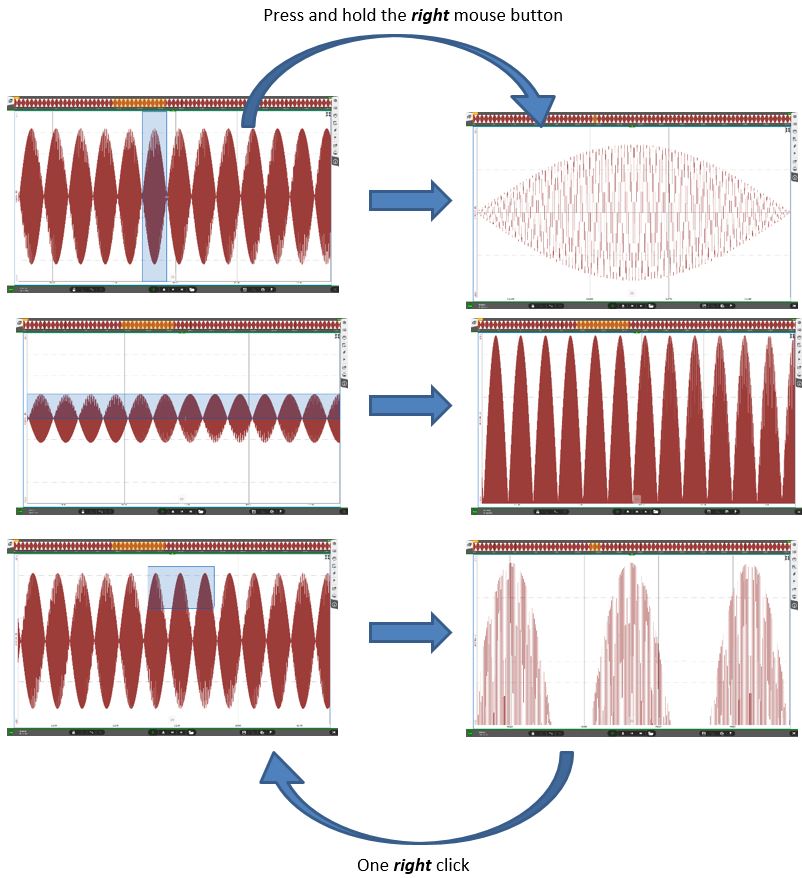 右键单击按住并拖动将放大特定区域的波形 (只有当波形处于冻结状态可用)。