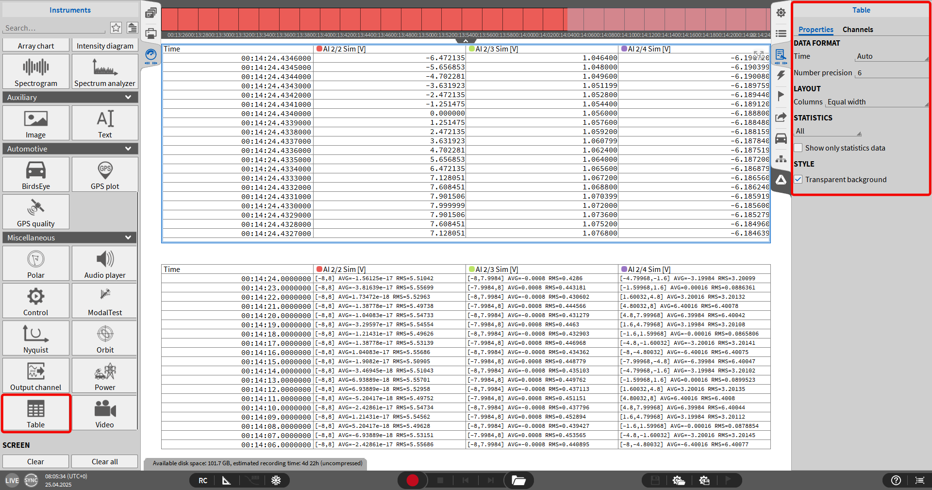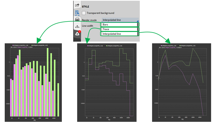 显示数值: 数字显示表显示的数值的类型, 实时值、平均值、 有效值、 ACRMS、 最小值、 最大值、 峰峰值。 除了实时值外, 其他的数值都是按照一定时间段进行统计, 时间间隔可定义为: 0.1s、0.25s、0.5s、1.0s,延迟, Sat (占用率可视化)。