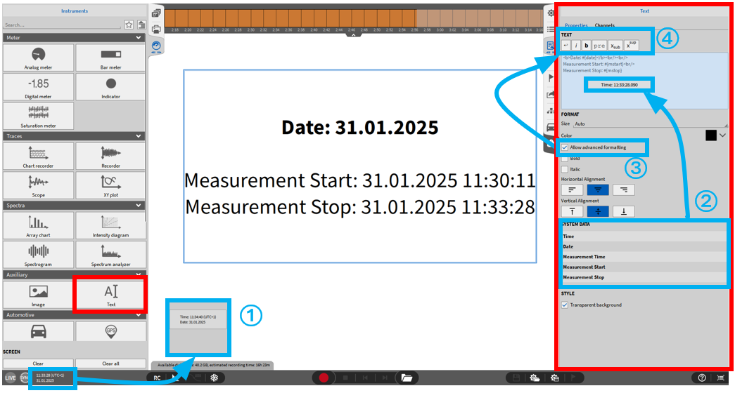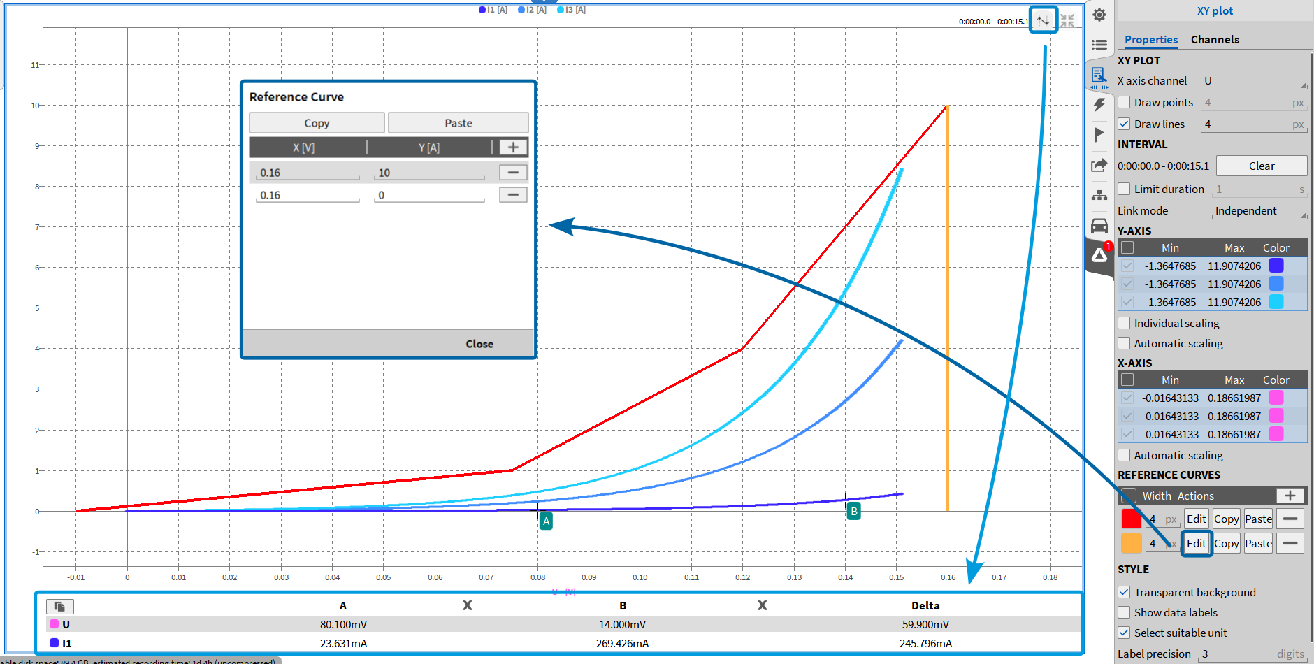 在回放模式下,点击一个数据点将永久显示其标签。每个永久标签都可以单独定位和移除。通过取消勾选仪器属性中的“显示数据标签”选项,可以隐藏永久标签。禁用此选项可防止标签在记录器中显示,但不会删除已添加的标签。