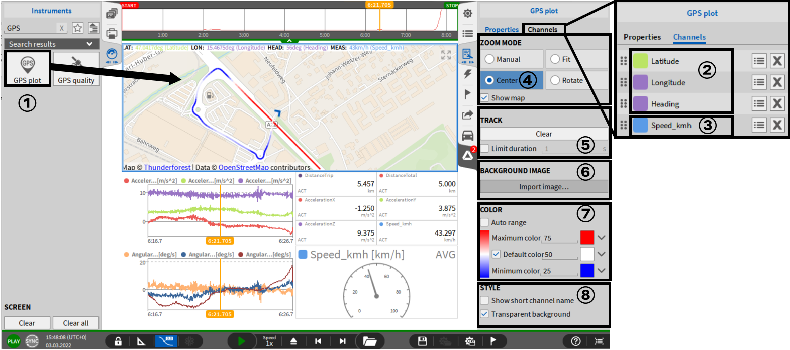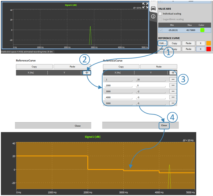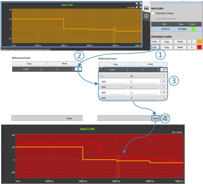 设置①、②和③适用于所有轨道图类型,因为直径①用于设置相对于圆间隙/轴承的旋转。从这个角度来看,极限②有助于在超过移动半径时轻松识别。测试的旋转方向可以简单地通过③标记,但对后台的显示或计算没有进一步的影响。其他设置将在下面的示例中进行说明。