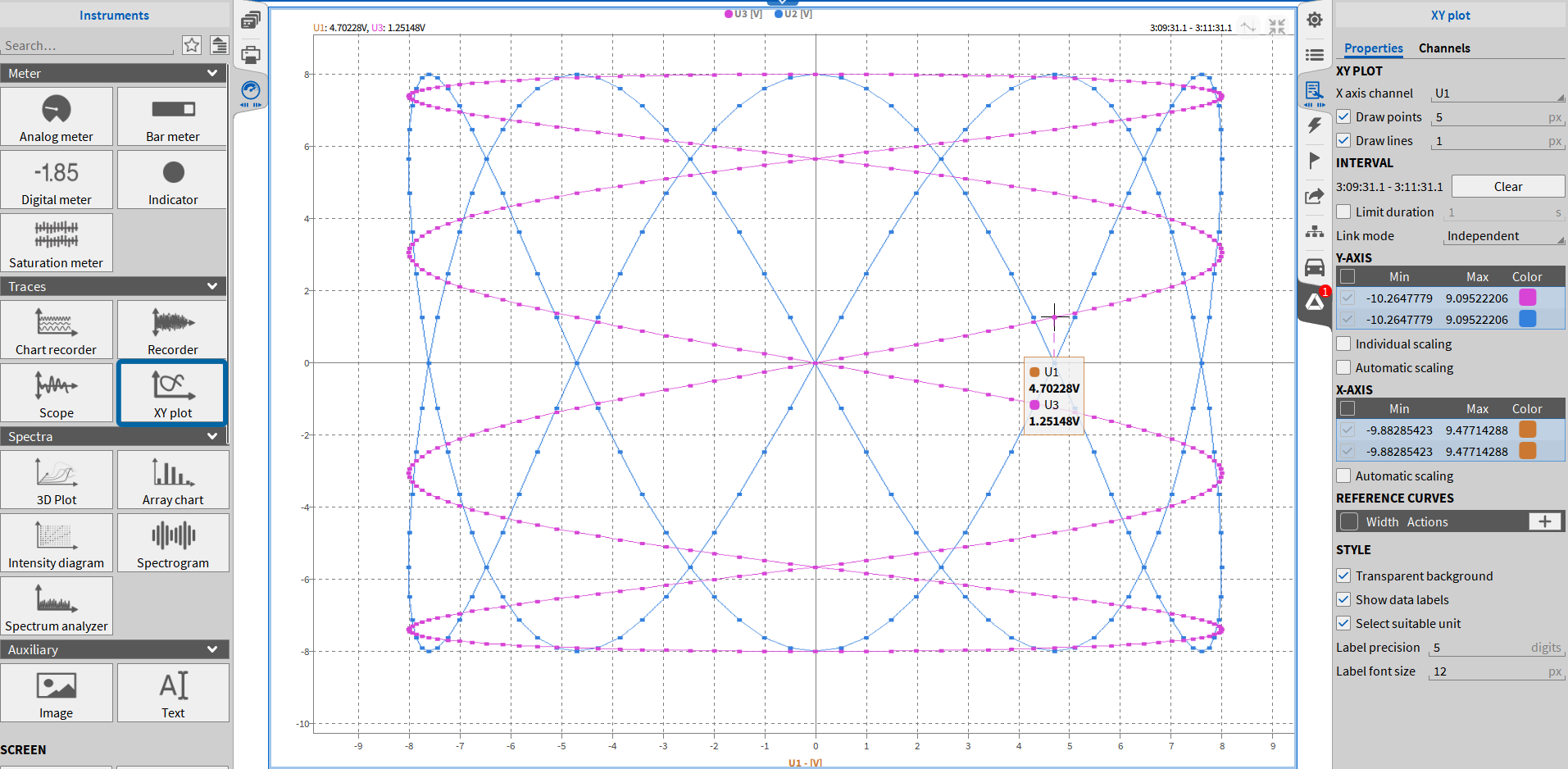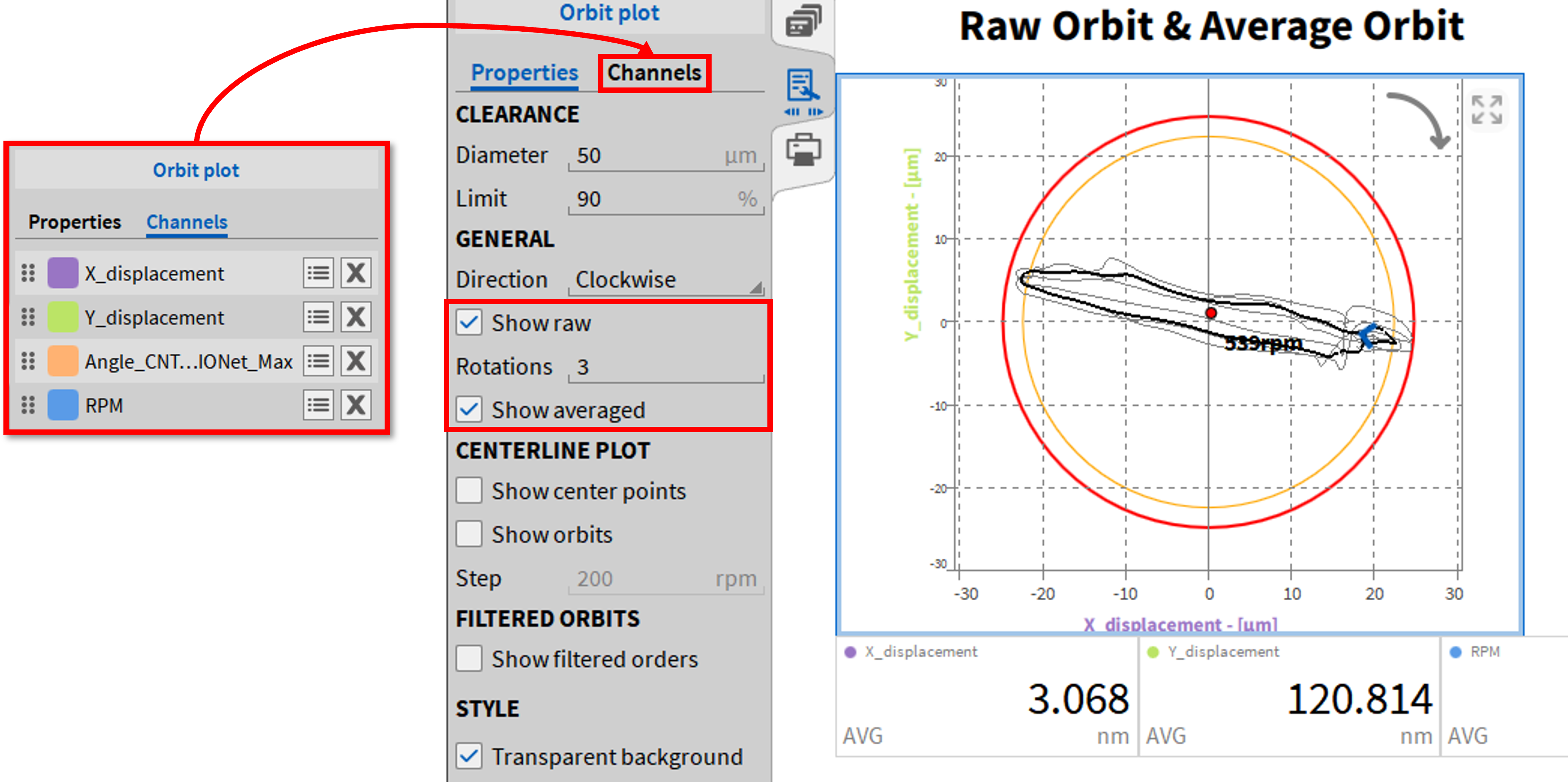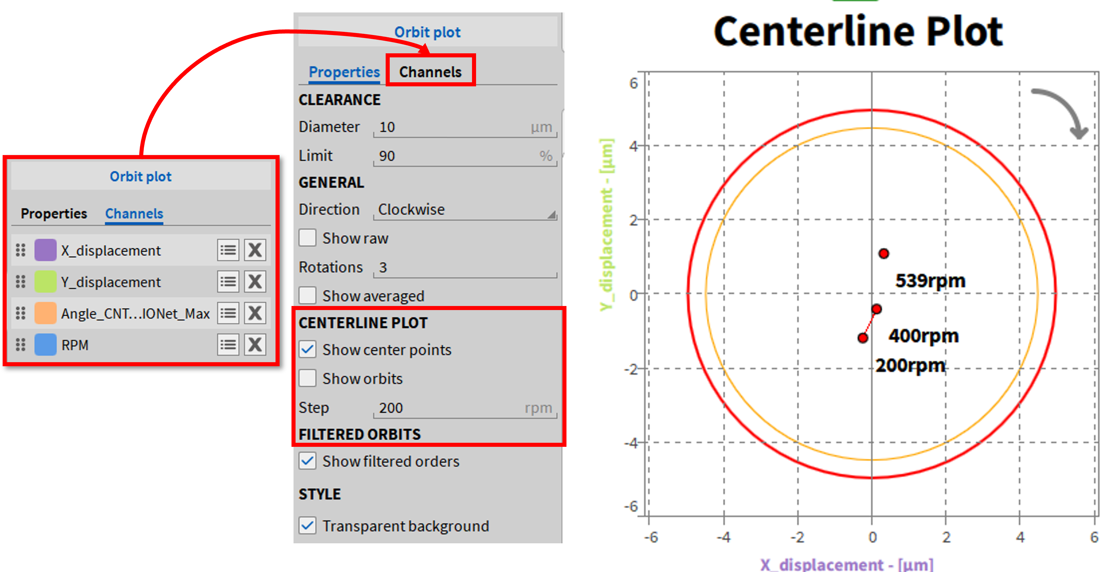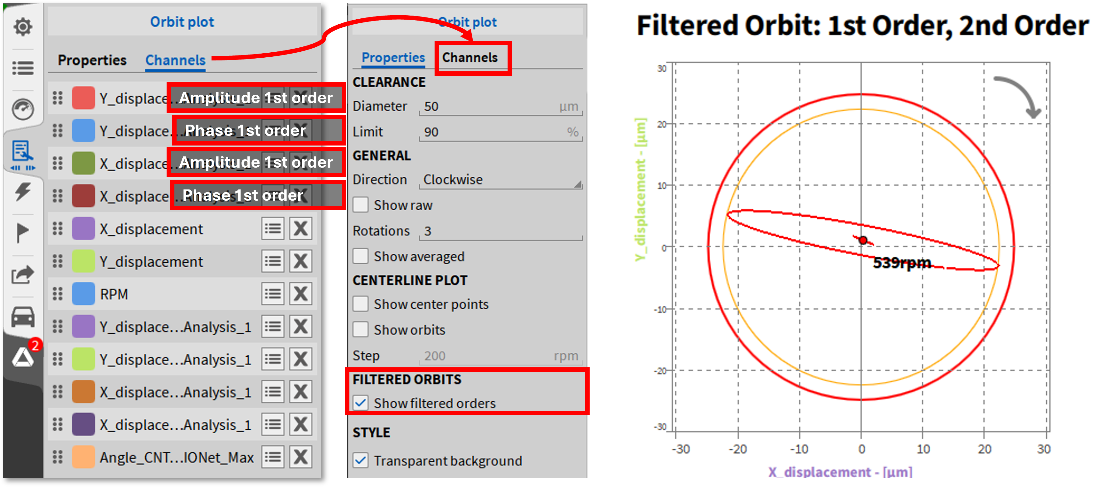 轴心轨迹图有三个显示选项,可以单独激活,也可以在仪器设置中组合激活。但其中一些需要不同的输入信号。输入通道的缩放必须事先在通道列表中进行。轴心轨迹图仅仅是一个显示仪器,即没有单独的轨道图通道。