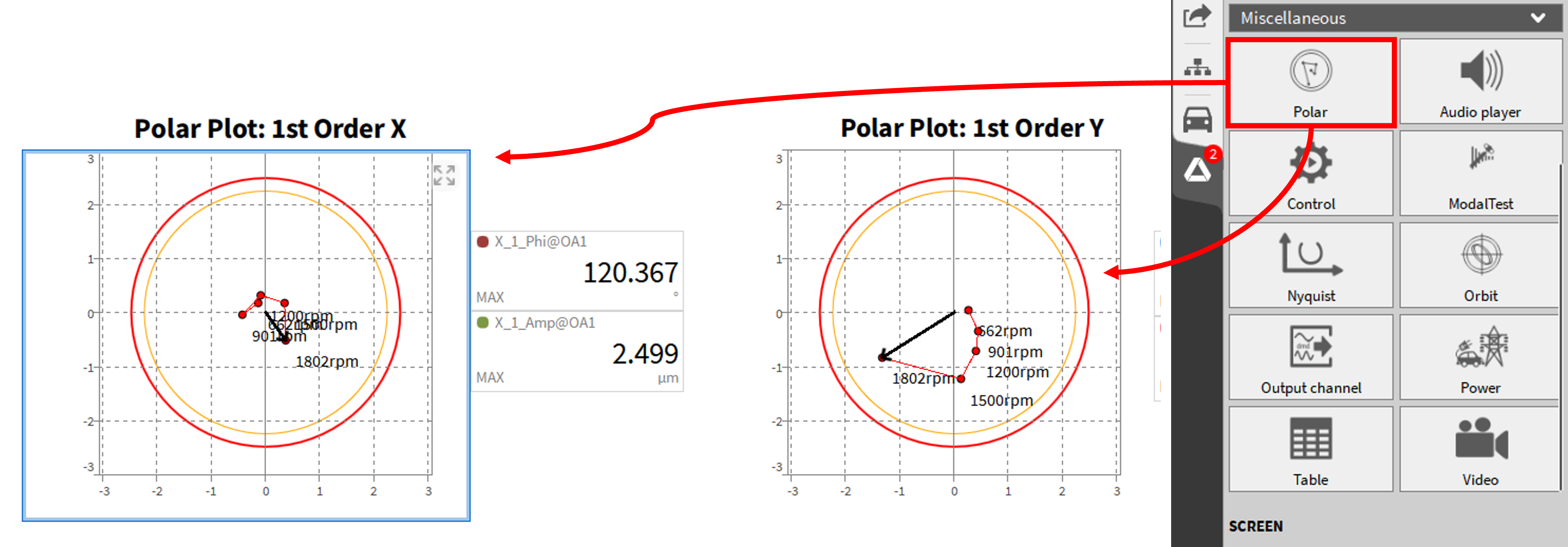 极坐标图是对轨迹分析的补充,也是一种纯粹的显示仪器,没有自己的通道。极坐标图可用于在极坐标中显示矢量信号,例如,与轴的速度有关的一阶X偏转的振幅和相位。在极坐标图中,振幅显示为半径,相位显示为角度。用阶次分析法计算振幅和相位。