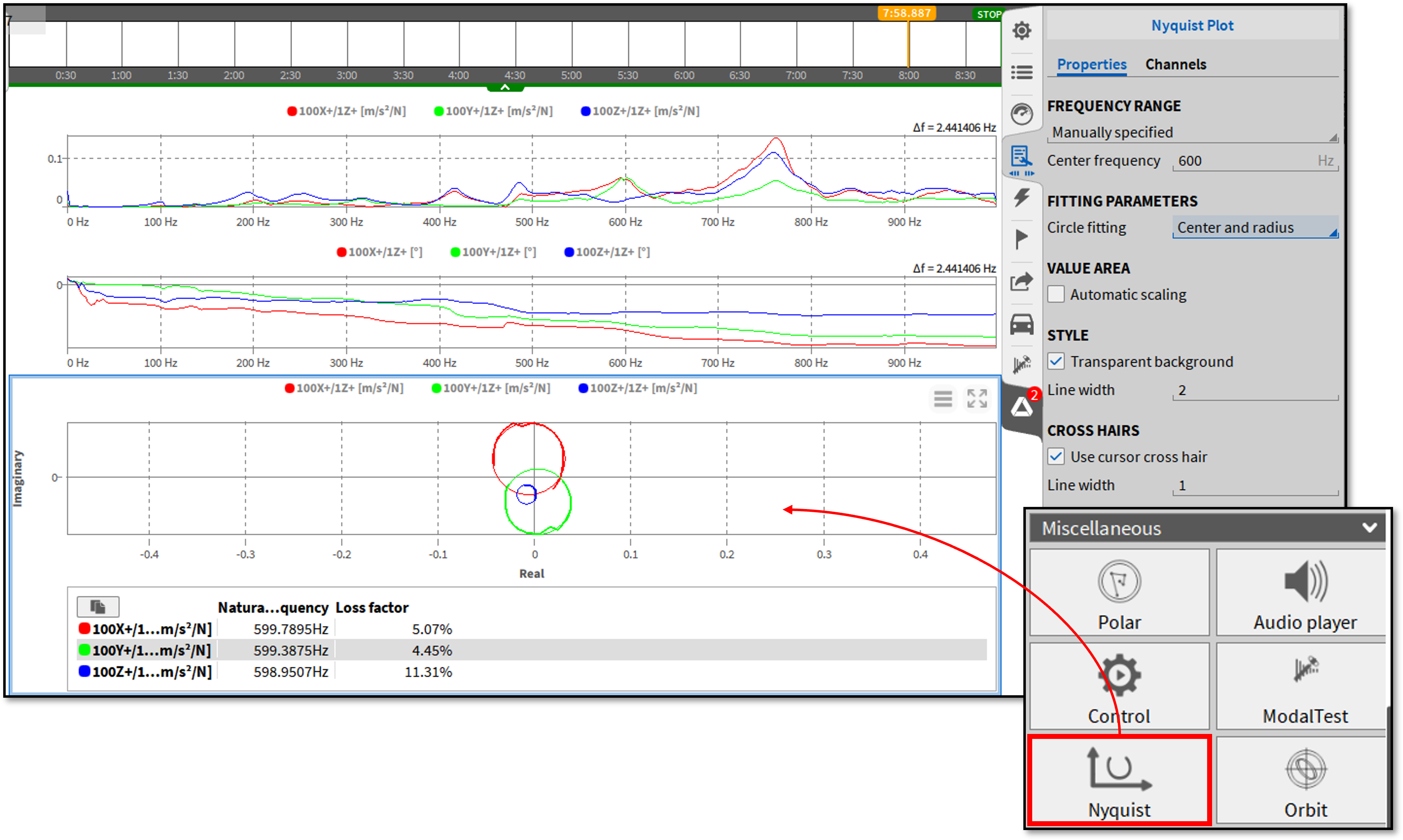 Nyquist图是一种可以从数值上确定固有频率和损耗因子的工具,损耗因子基于模态试验中的频率响应函数(FRF)通道。这些数据被绘制成一个圆,然后进行插值。本分析图形也有相应的显示工具对应。