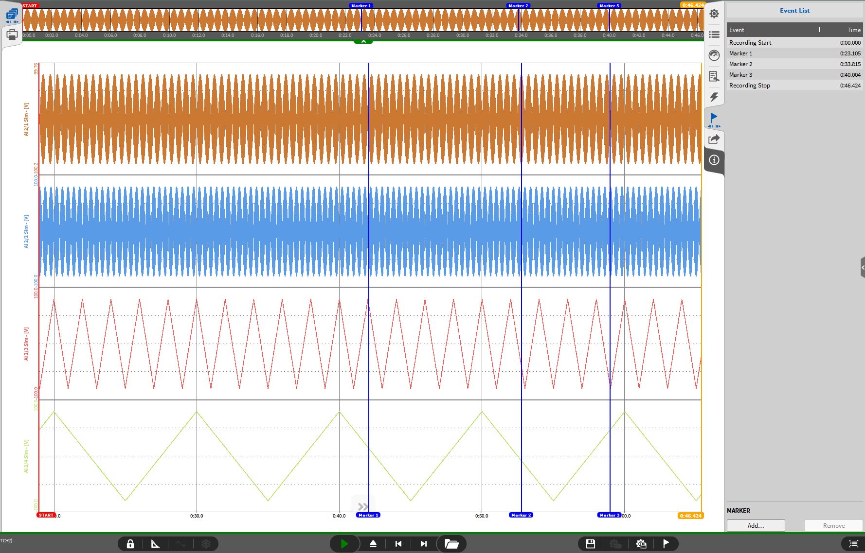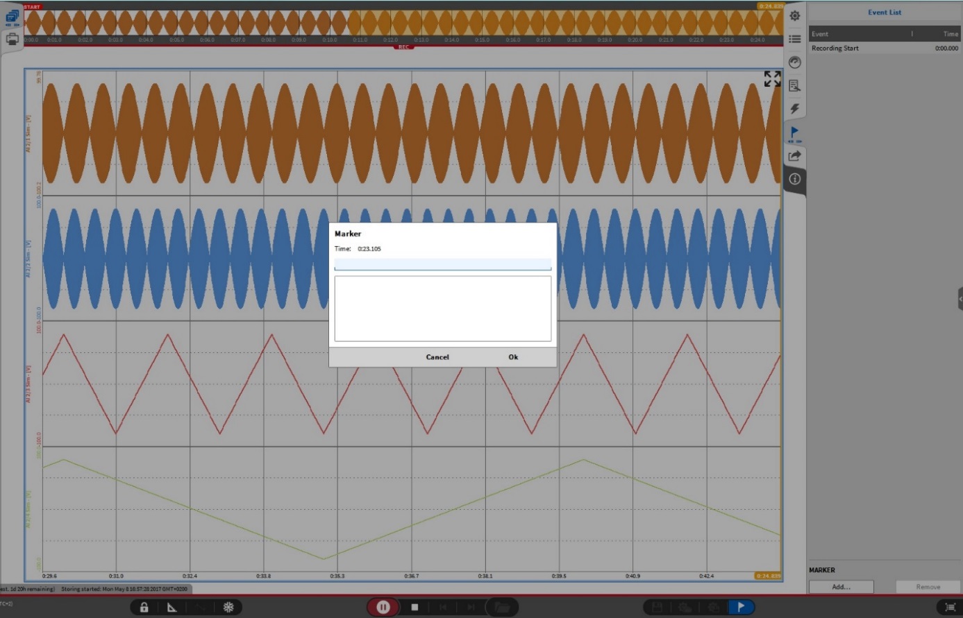 此标记列表会保存到数据文件中, 当进行数据回放时, “标记”选项会在下方的工具栏出现, 同样在波形记录仪内, 也会显示所保存的事件列表 (见图 Fig. 571). 在数据回放模式下, 依旧可以继续添加更多的标记