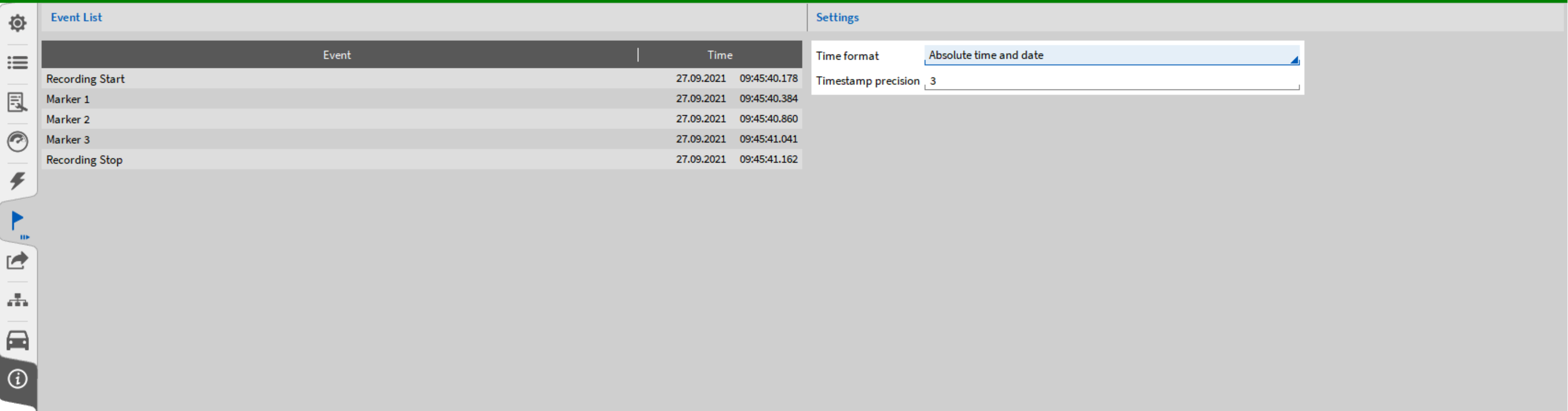 将事件列表全屏展开后, 可以在此界面选择时间格式和时间戳精度 [ms], 这些信息会显示在测试界面。