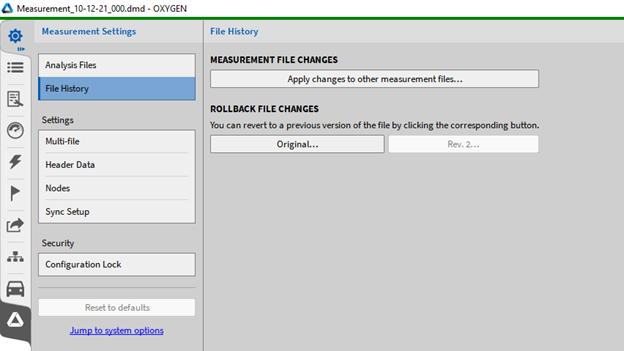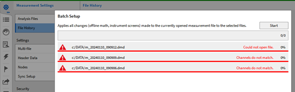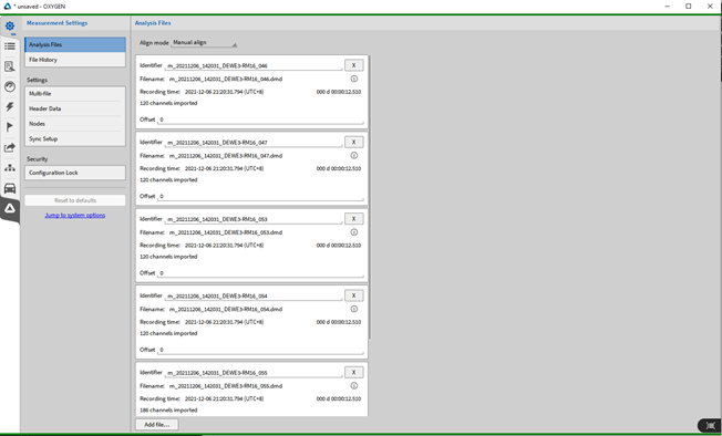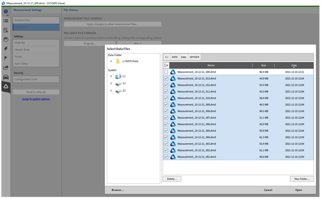 要实现此功能,只需打开一个测量文件,在完成分析和后处理后保存文件后,打开测量设置的完整菜单,然后转到文件历史记录(见 图. Fig. 602). 。通过点击“应用到其他测试文件”按钮,然后在对话框内选择需要打开的文件(见图 Fig. 603)。仅可选择在一个文件夹内的数据文件。