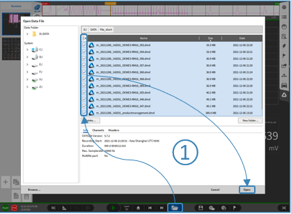 有两种方法可以实现多文件打开操作,点击测试界面的“文件夹”按钮(见图. Fig. 600) 选择需要打开的文件,或者打开全屏设置界面,测试设置-文件分析,点击“添加”按钮(见图 Fig. 599) ,并选择所需要打开分析的文件。