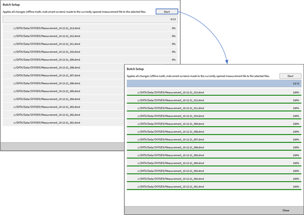 在文件分析和后处理的过程中,对某一文件的修改可以应用到其他的测试文件中。这使得用户在对于大量的重复实验数据的后处理时,可以将一个文件的数据处理用于所有的测试数据。当然,所有的测试数据必须具有相同的设置以及相同的通道。以下的处理类型可以应用到多文件处理当中: