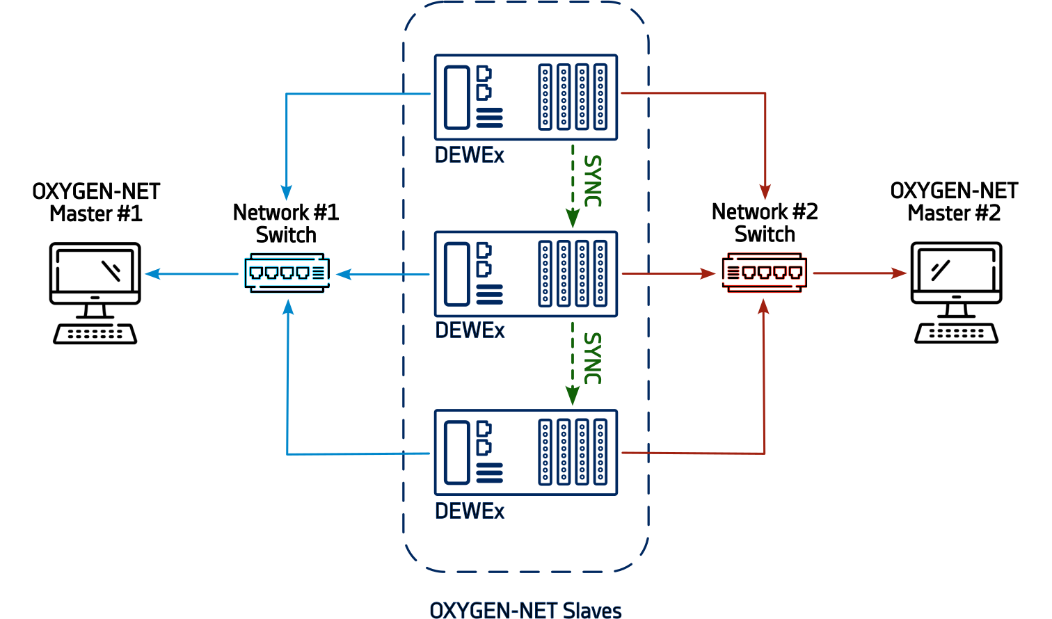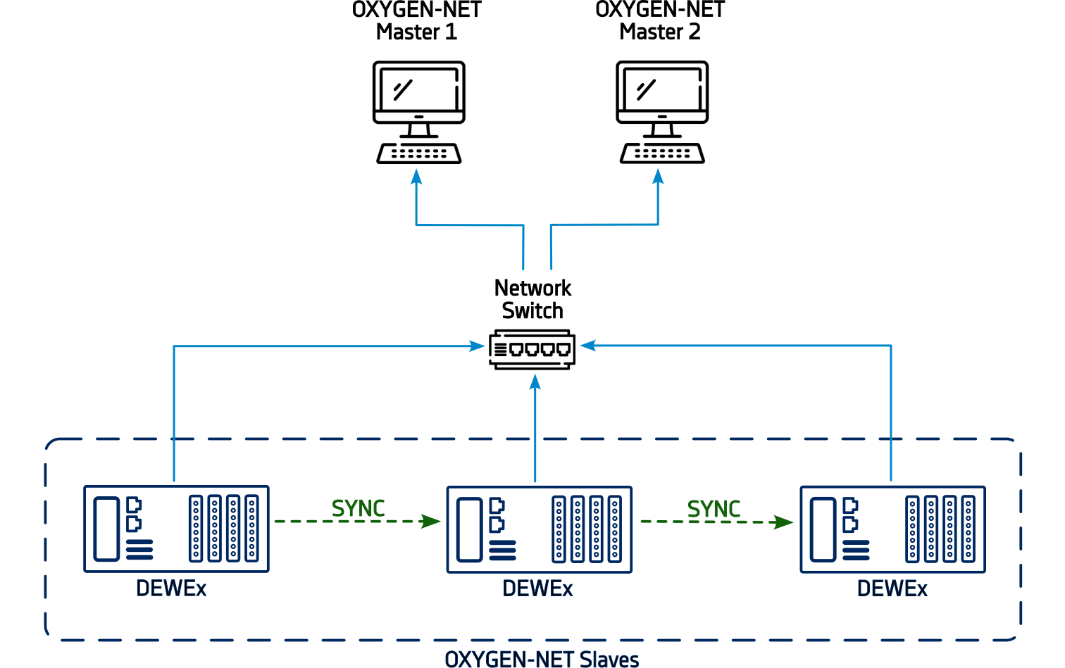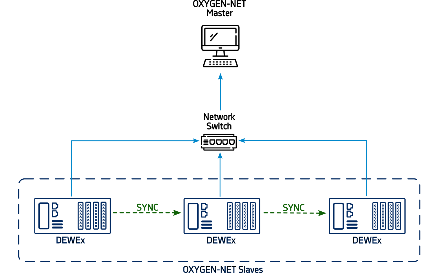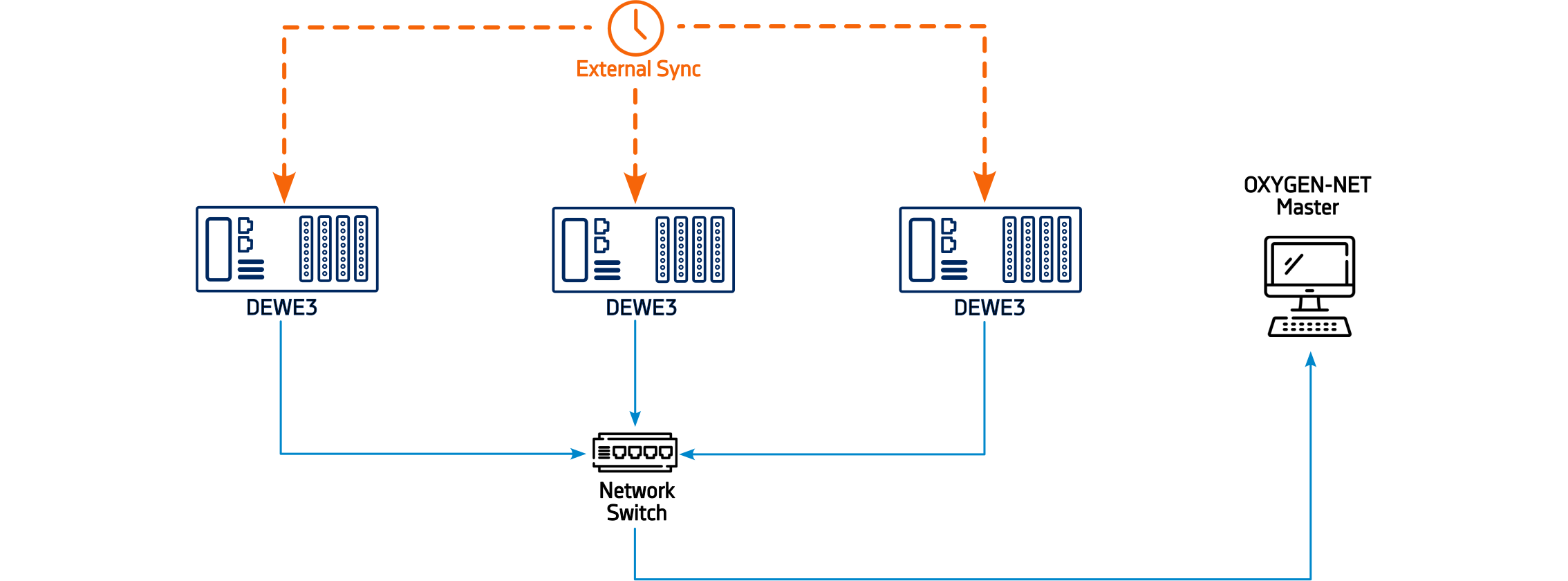 OXYGEN-NET可以将多台DEWE2I3设备通过同一个局域网连在一起,组成一个多通道的采集系统。所有通过OXYGEN‐NET 组网的DEWE2/3 系统都可以进行同步, 并被一台主机控制。
