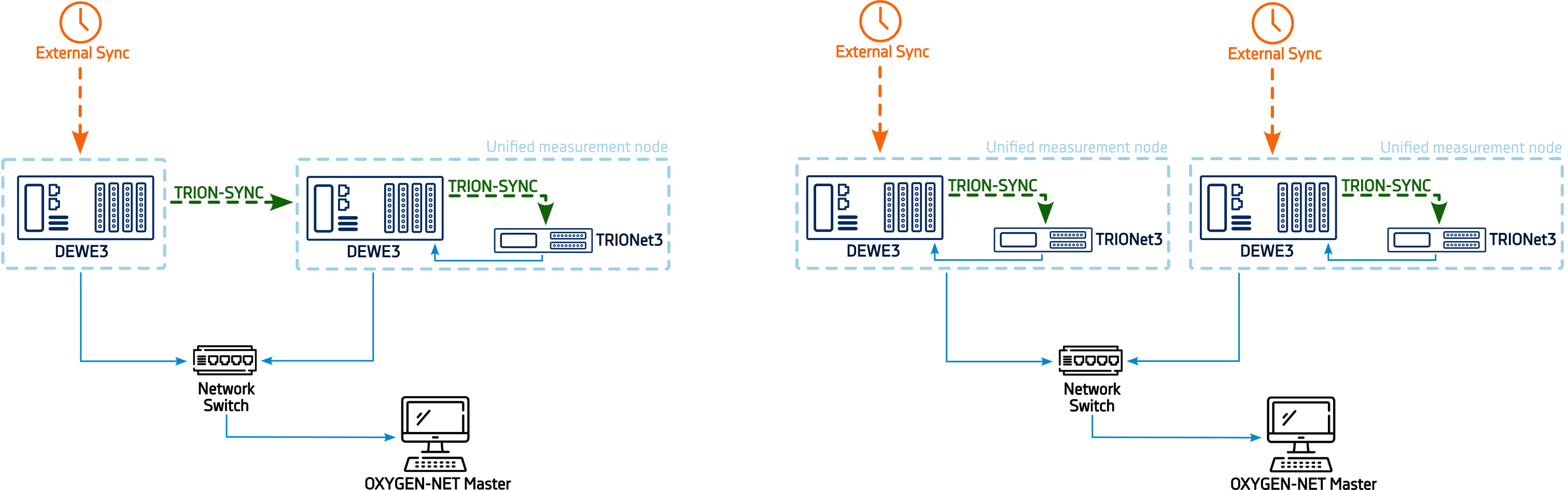 TRIONet3是一个前端设备,因此它在连接到另一个设备时不会创建一个OXYGEN-NET网络。将其集成到现有的OXYGEN-NET系统中不会改变网络拓扑结构。仅是将TRIONet3作为连接设备的扩展,两者都作为统一的测量节点。然而,TRIONet3仍然需要网络和同步连接。Fig. 629 显示了包含TRIONet3设备的两个示例拓扑。