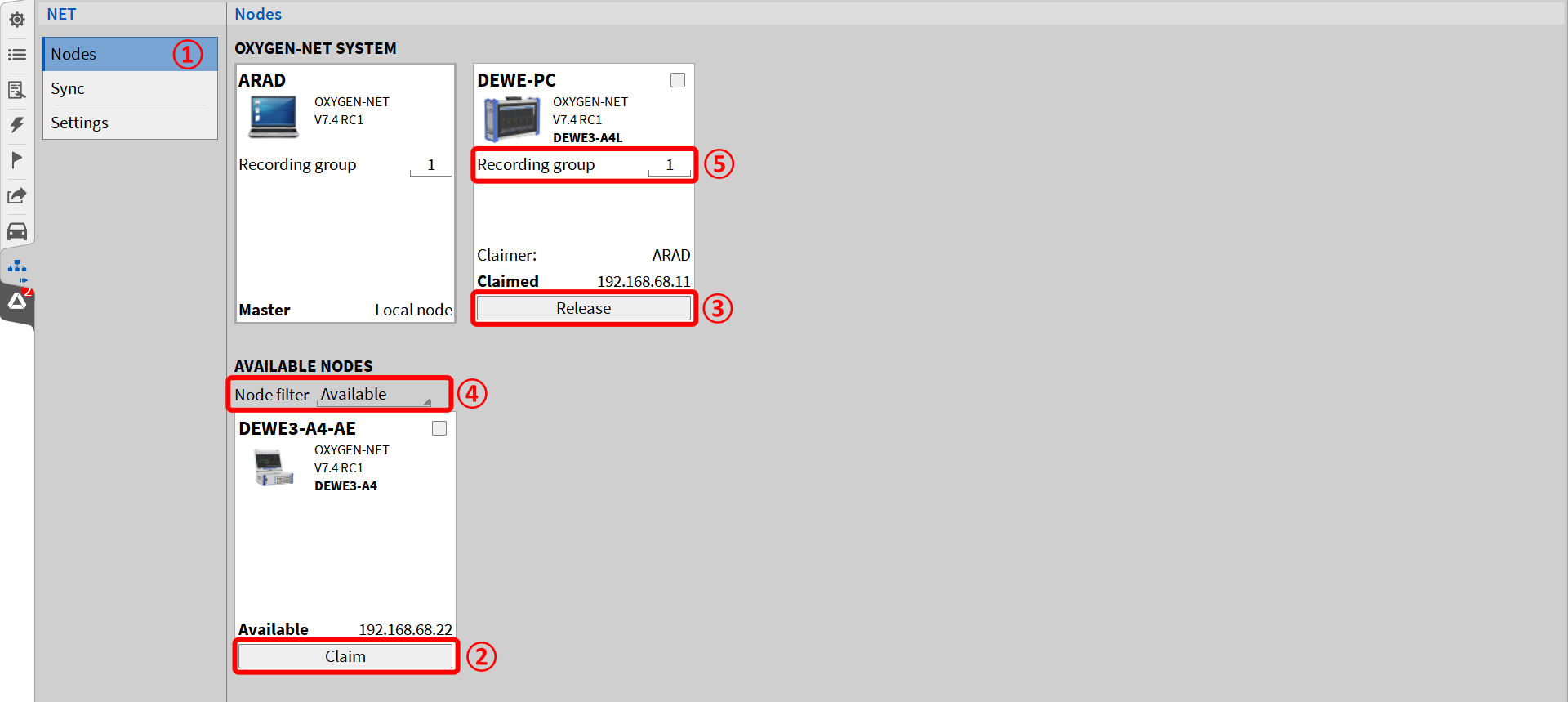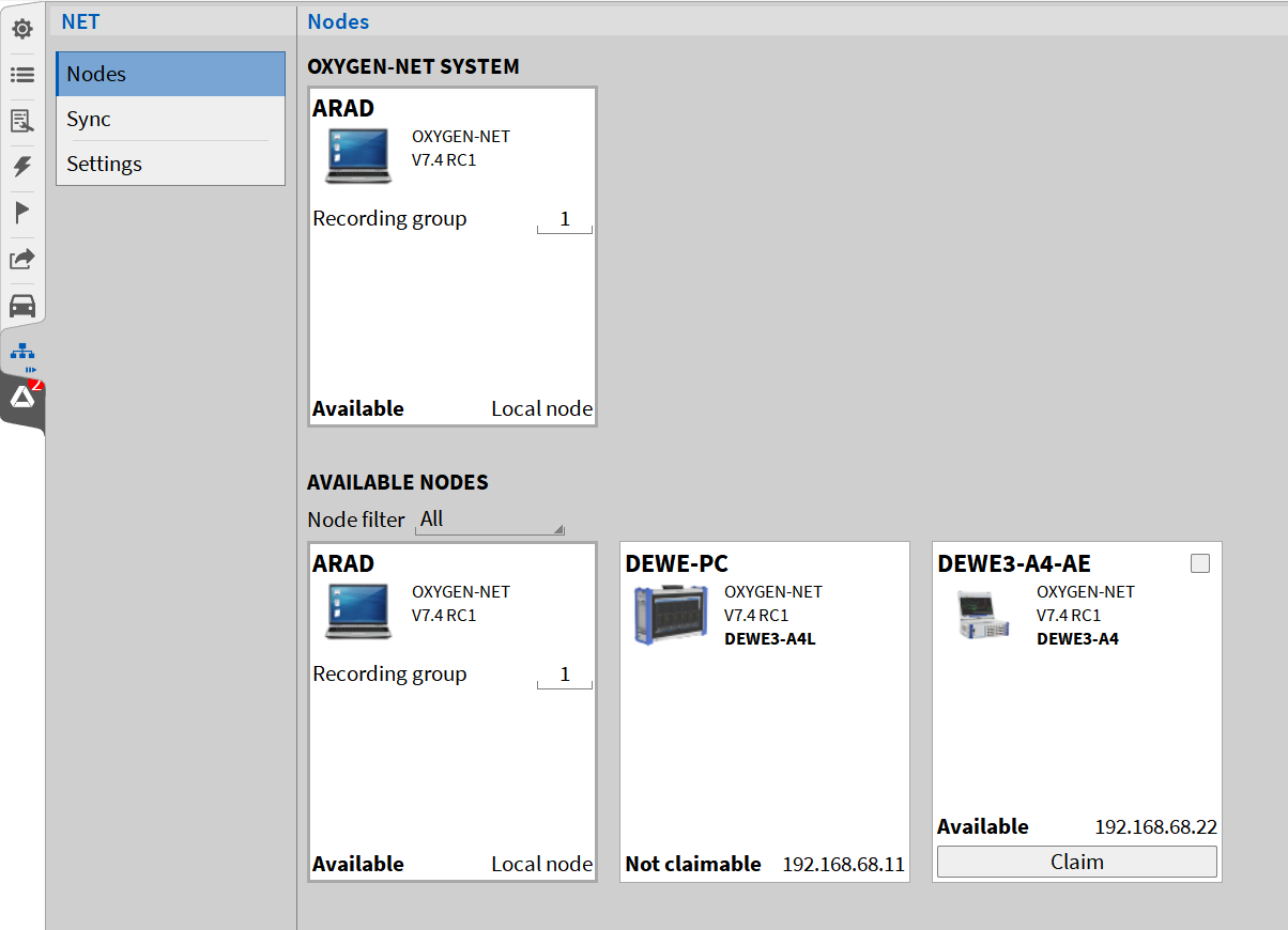 节点(见图:numref:nodes-menu)提供了连接到同一以太网的所有测量设备的概述。“可用节点”部分显示所有可用的设备,而OXYGEN-NET SYSTEM部分显示连接到这个主单元的所有从单元。要创建或扩展一个OXYGEN-NET网络,必须在所需组网的每个设备上激活 “允许OXYGENNET” 选项。此外,要允许锁定设备,必须启用 “允许锁定” 选项。