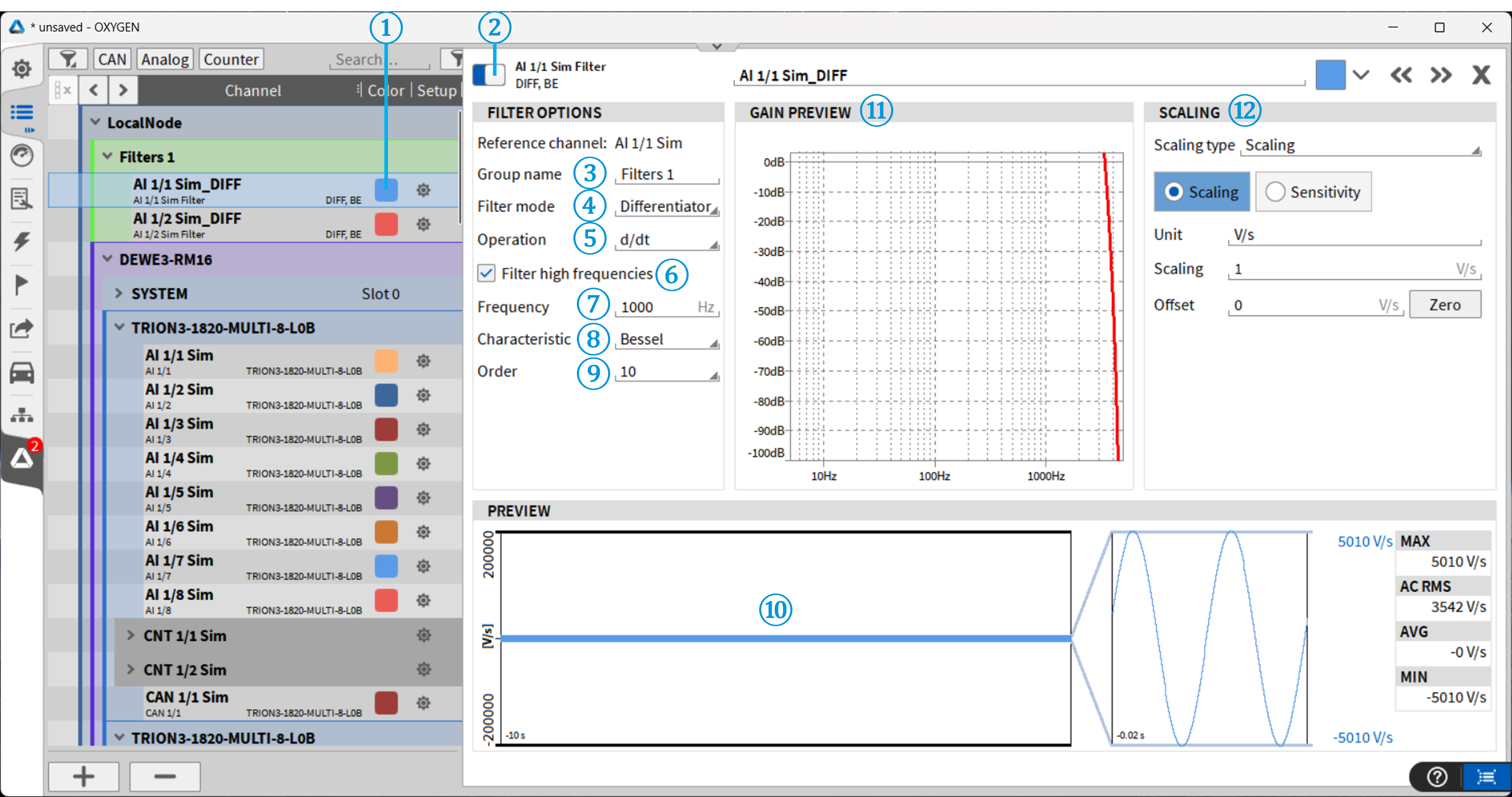 Channels of data type double with physical unit can optionally be scaled (see ⑰ in Fig. 173). This option might be used for changing the physical channel unit from (kilo)meters to miles or km/h to mph.